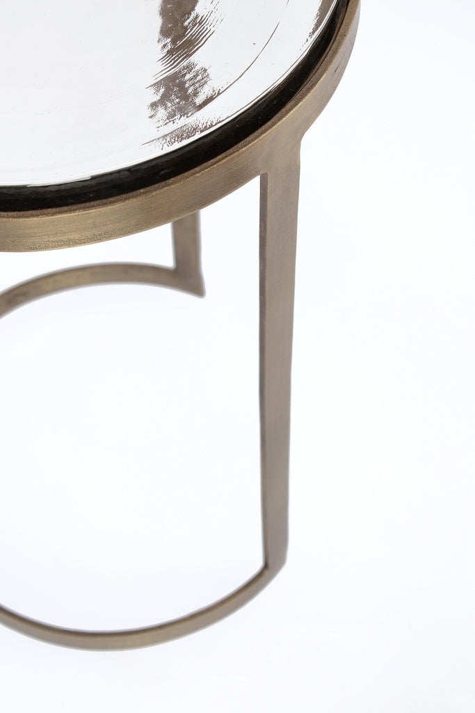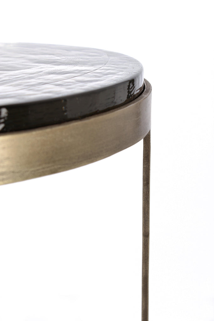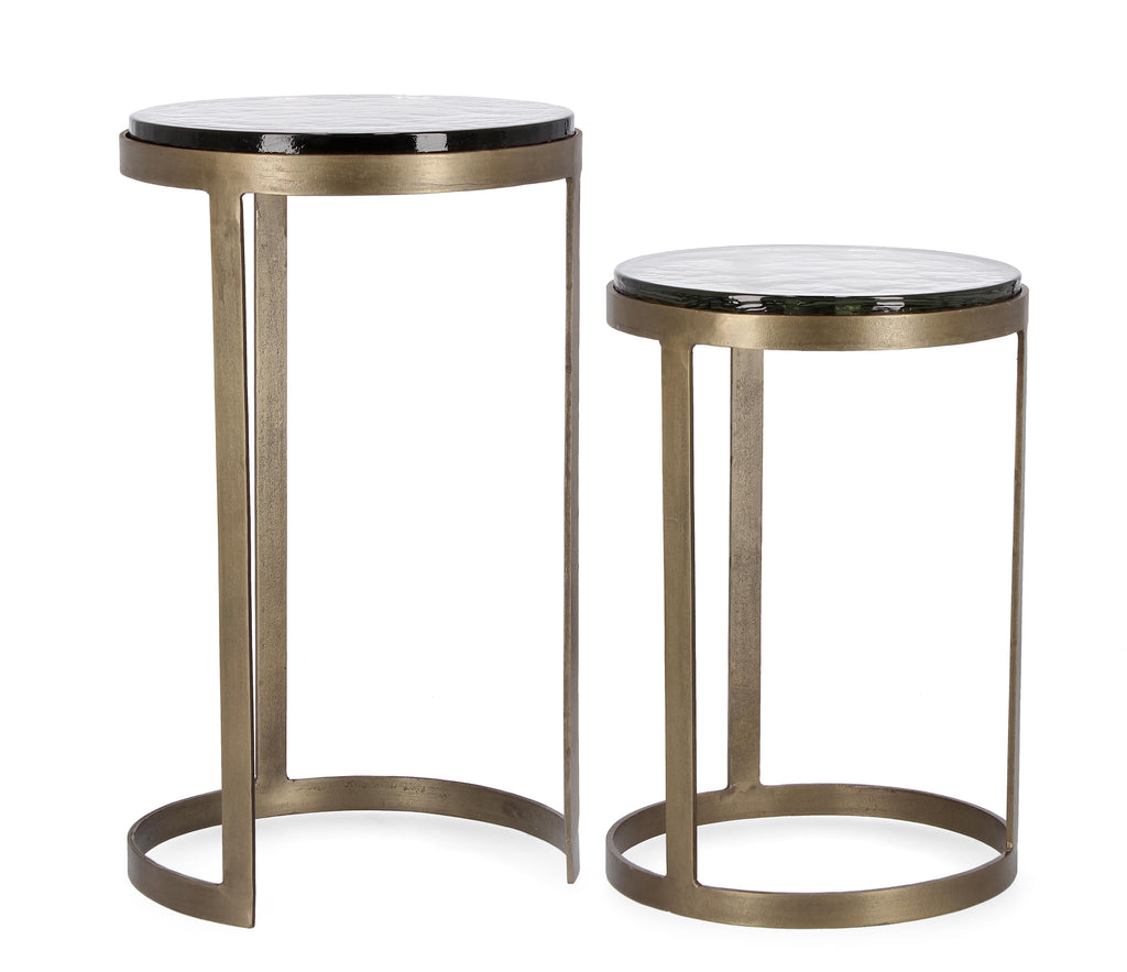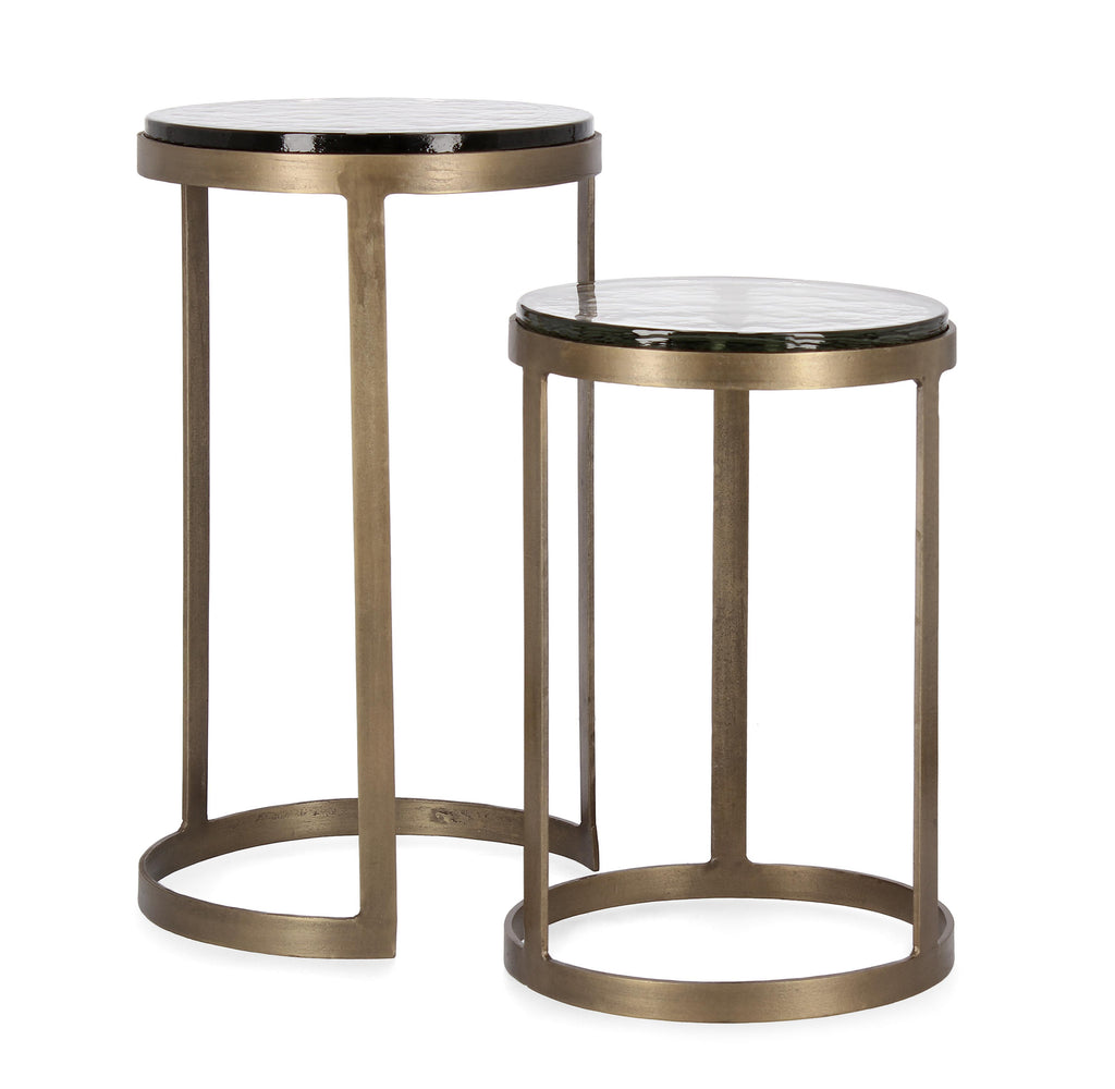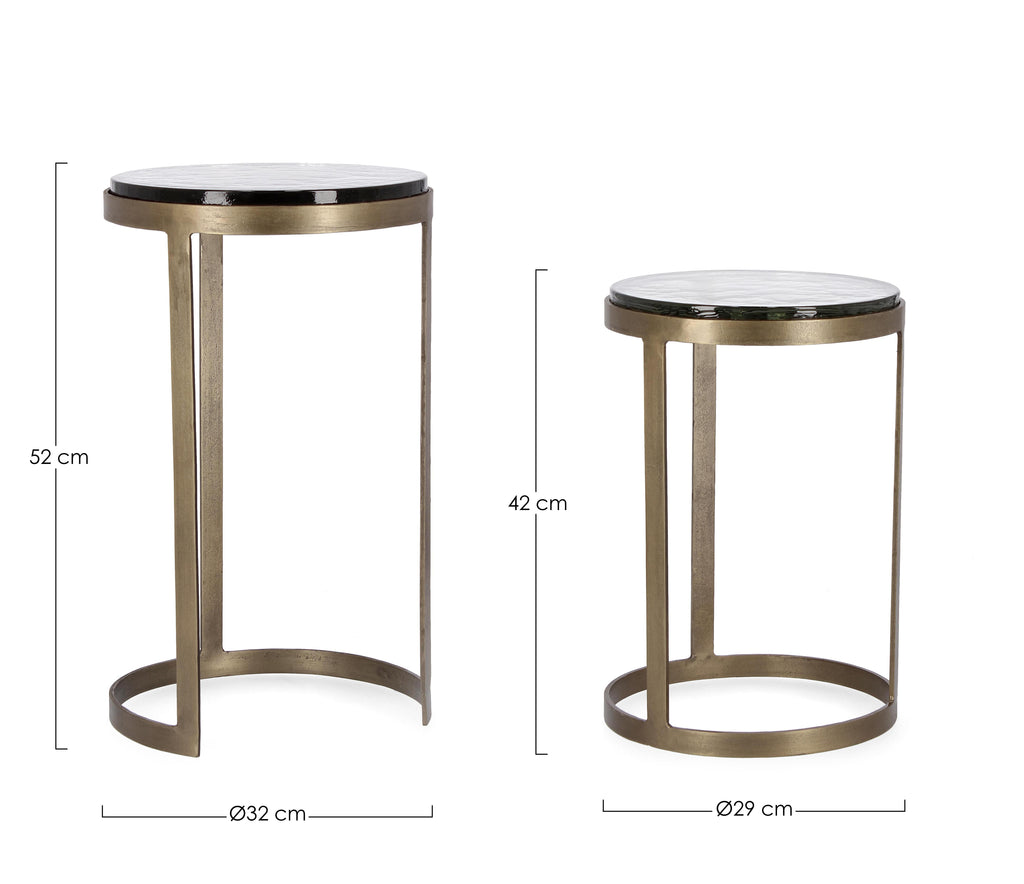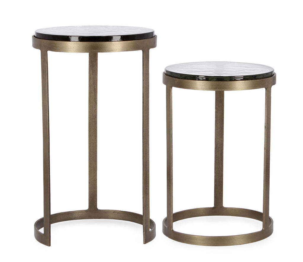 Βοηθητικά τραπέζια σε σετ των δύο τεμαχίων, από σφυρήλατο μέταλλο στο χρώμα του ορείχαλκου, με παλαιωμένο φινίρισμα.